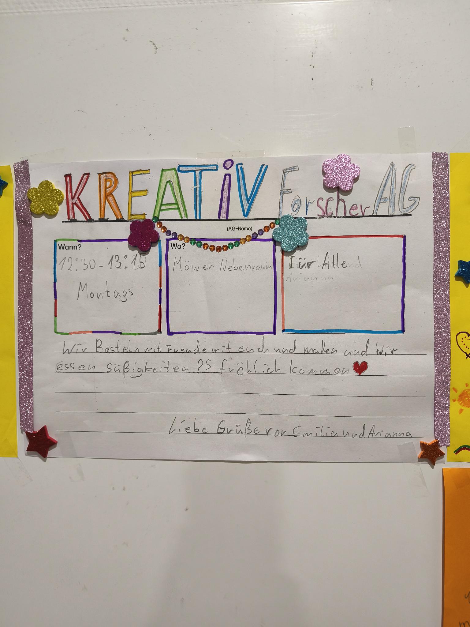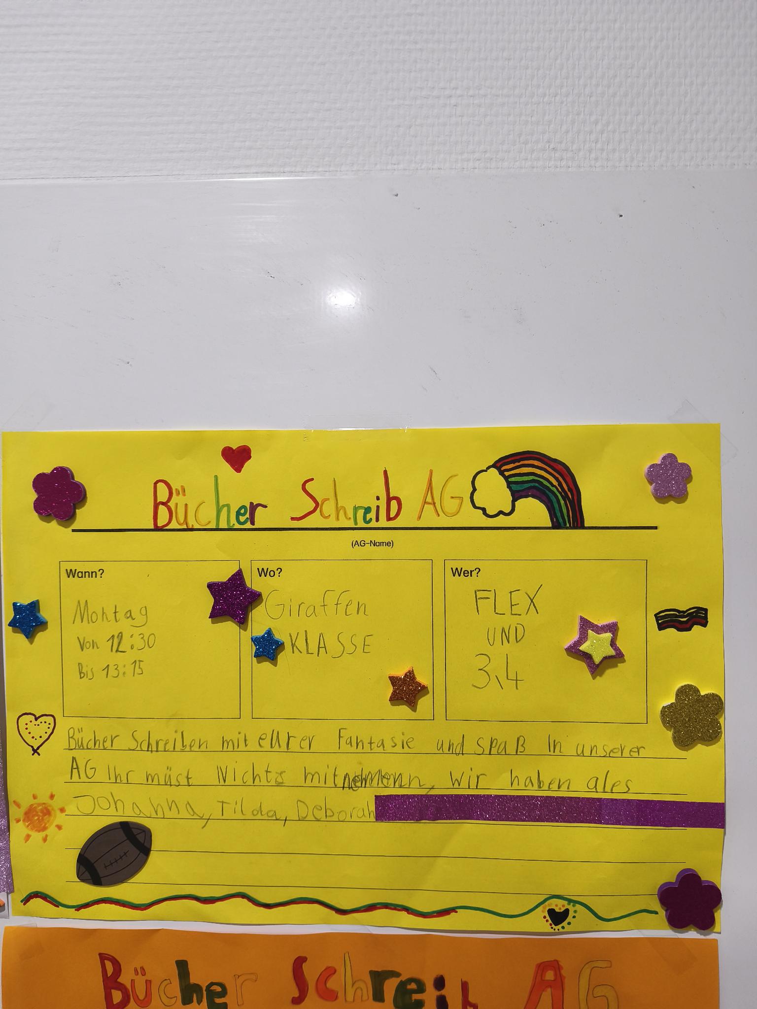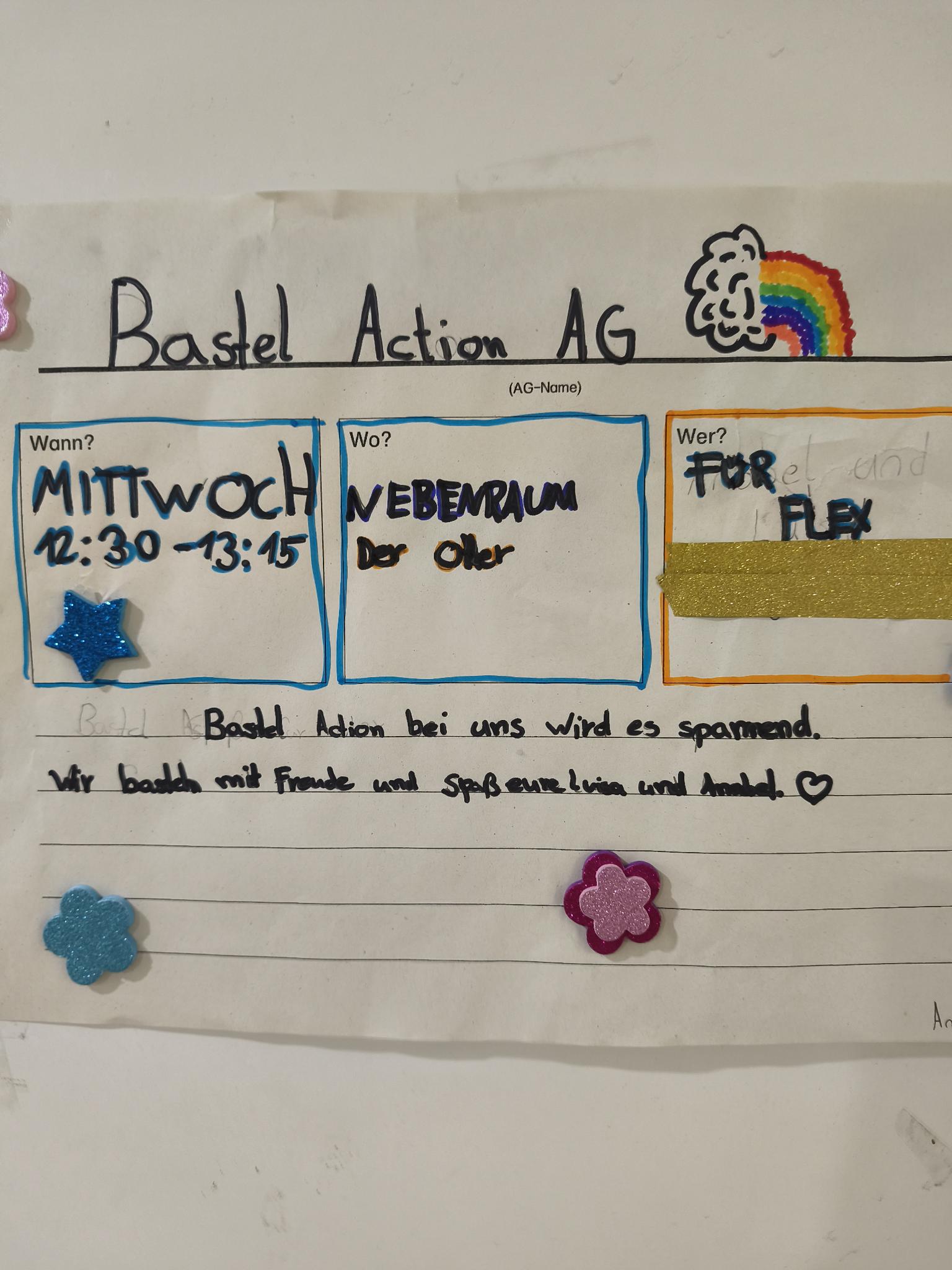 An unserer Schule dürfen Kinder selbst eine Arbeitsgemeinschaft (AG) anbieten – und werden dafür gezielt vorbereitet. Wer Lust hat, eine Idee in die Tat umzusetzen, nimmt vorab an einem Coaching teil. Dort lernen die Kinder, wie man ein Angebot plant und vorstellt: von der Werbung bis zur Durchführung.